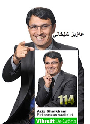 عەزیز شێخانی: قورسایی ههرهزۆری ههڵمهتهكانی ههڵبژاردن له سهر شان و پیلی خۆم بوه. به پاشهكهوتی خۆم و ههروهها قهرزكردنی بڕه دراوێك له بانك ههڵمهتهكانی ههڵبژاردنم ههتا ئهمڕۆ هێناوه. جێگای خۆیهتی ئاماژه بهوه بكرێ كه ژمارهیهك دۆست و ناسیاو به گوێرهی توانا یارمهتیدهر بون. دهستخۆشی له یهكێك له براكانم و ئهو فینلهندیانه دهكهم، كه لهو بارهوه یارمهتیدهر بون. جێگای ئاماژهپێكردنه، كه له لایهن دهوڵهت و شارهداری و حیزبهوه هیچ جۆره یارمهتییهك نهكراوین. تهنانهت وهك بهربژێرێك بڕی ٥٠٠ یۆرۆم خستۆته سهر ژمارهی حیسابی سهوزهكان. ژمارهیهك له حیزب و رێكخراوه سیاسییهكان لهو پێوهندییهدا یارمهتی بهربژێرهكانیان كردوه، بهڵام حیزبی سهوزهكان لهو بارهوه كارێكی نهكردوه.